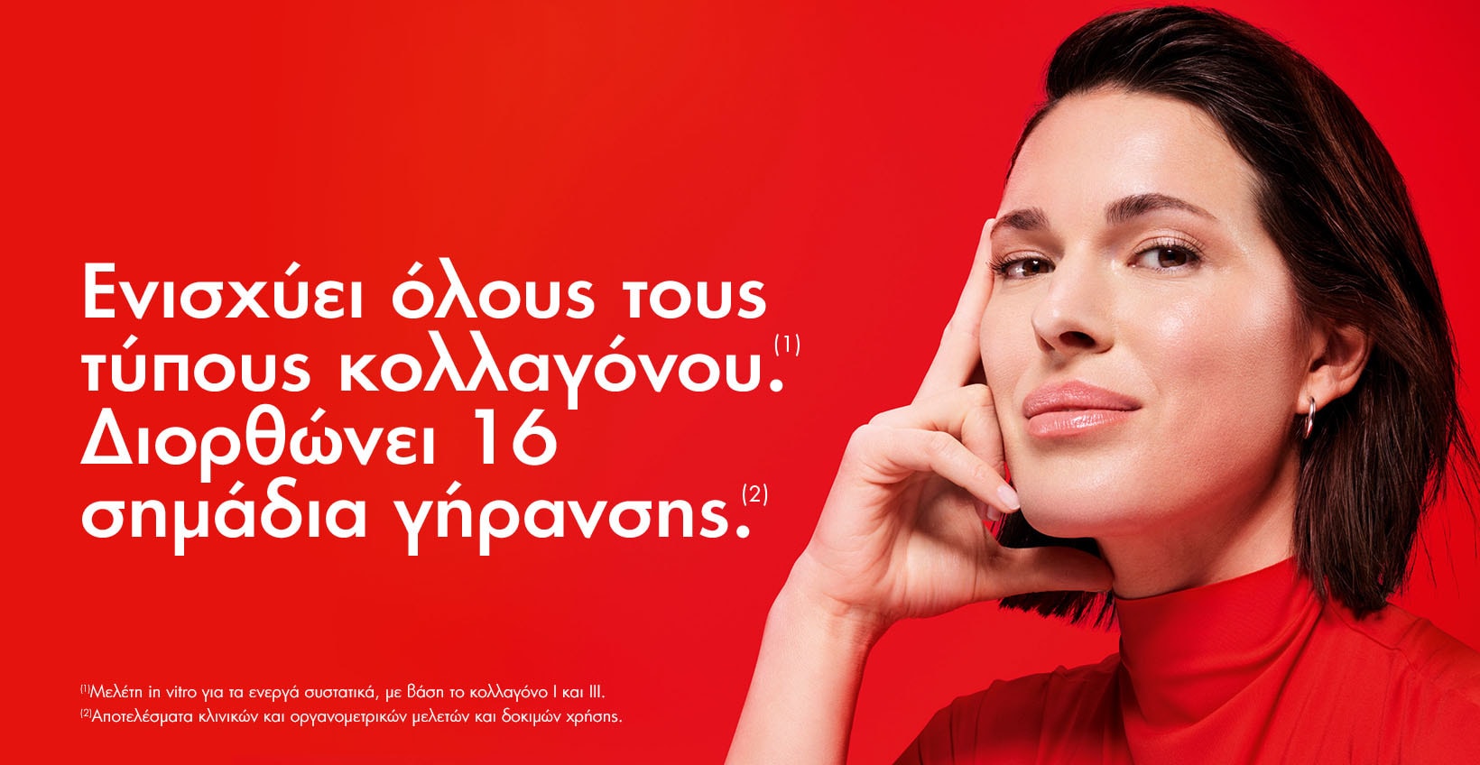 Ενισχύει όλους τους τύπους κολλαγόνου*. Διορθώνει 16 σημάδια γήρανσης**, δρώντας στις εξής παραμέτρους: ρυτίδες, λεπτές γραμμές, σφριγηλότητα, «γέμισμα», χαλάρωση, πυκνότητα, λείανση, υφή, τονικότητα, ενδυνάμωση, επιδερμιδική κυτταρική ανανέωση, λάμψη, απαλότητα, ελαστικότητα, ενυδάτωση, ομοιομορφία τόνου.