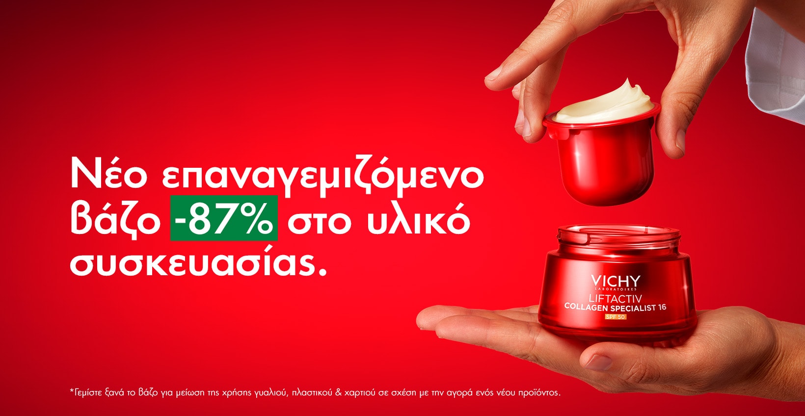 Χρησιμοποιώντας το ανταλλακτικό για να ξαναγεμίσετε το βαζάκι σας, συμβάλλετε στη μείωση του βάρους συσκευασίας κατά 87%*: