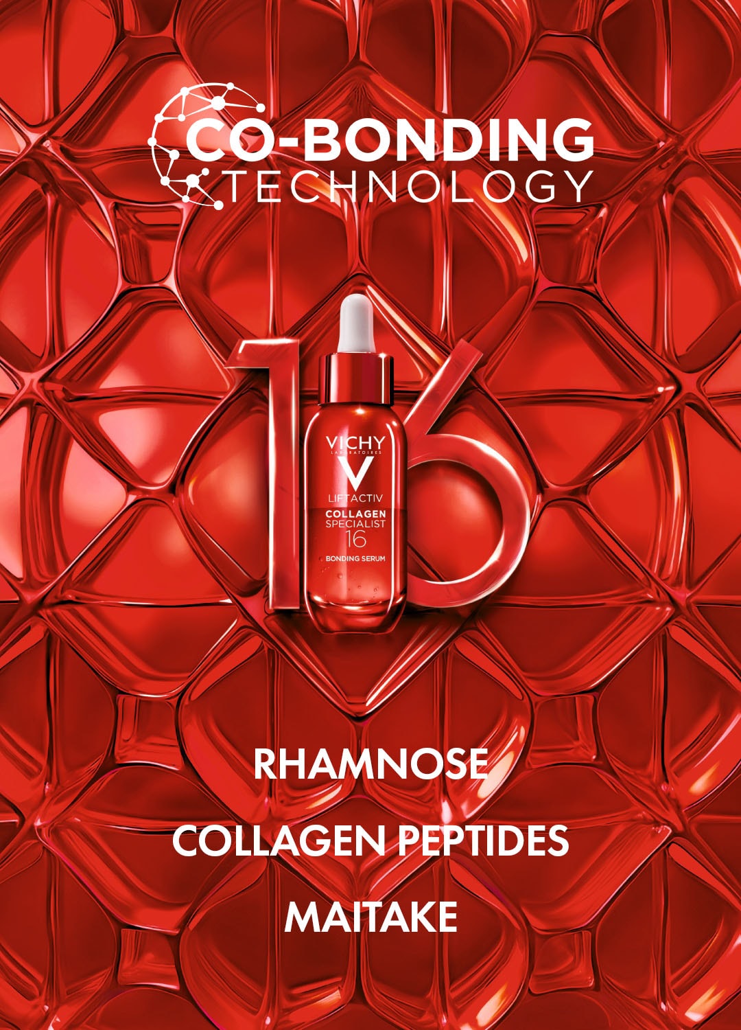 Το Vichy Collagen Specialist 16 Bonding Serum, εμπεριέχει την αποκλειστική μας Τεχνολογία Co-Bonding, έναν πανίσχυρο συνδυασμό Ραμνόζης, Πεπτιδίων και Maitake. Τα τρία αυτά συστατικά δρουν σε συνέργεια αναζωογονώντας την επιδερμίδα. Η Ραμνόζη, ένα φυτικό σάκχαρο, ενισχύει αποτελεσματικά την παραγωγή κολλαγόνου. Τα πεπτίδια ενδυναμώνουν την επιδερμίδα βελτιώνοντας τη σφριγηλότητα και την ελαστικότητά της. Και το Maitake, ένα ισχυρό εκχύλισμα μανιταριού, παρέχει την απαραίτητη αντιοξειδωτική προστασία, προστατεύοντας την επιδερμίδα από την πρόωρη γήρανση που προκαλούν οι περιβαλλοντικοί επιθετικοί παράγοντες.